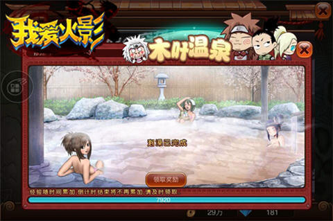 《我爱火影》杜绝升级、获取金币困难!众多日常福利,让玩家轻松游戏,不再担心经验、金币!如挂机即可获得大量经验的木叶温泉系统,在挂机获取经验的同时,还可以正常进行副本或竞技厮杀,经验与快感并存,让玩家在轻松获得经验之时,还可享受厮杀的快感。