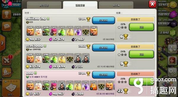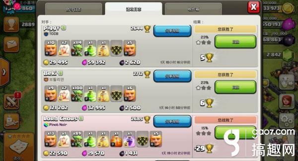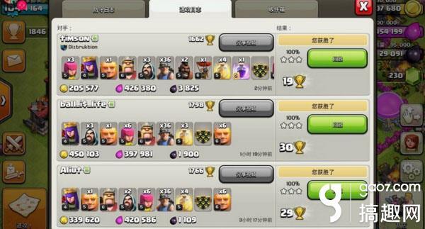 1.哥布林流,这号九本科技全满,王是一直躺着的,撸资源全靠弹跳哥布林,以我惯用的配兵方式是10胖+120哥布林+2天使。药水1狂+1跳+1治。胖子天使开墙,加弹跳进中圈,哥布林爆大本爆黑。有图有真相: