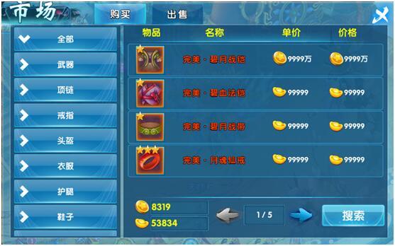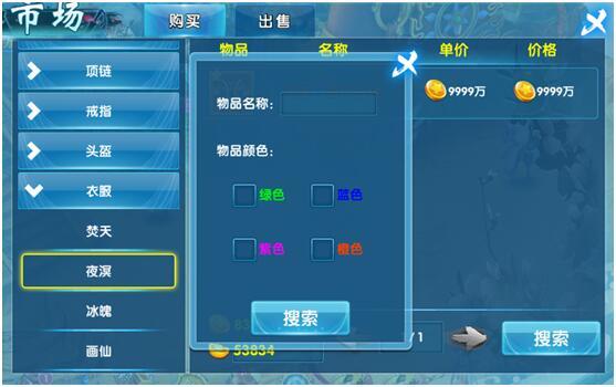 市场会按物品的价格排序,玩家可以直接在众多物品中选择自己需要的,当然这样无疑会浪费大量时间,因此,市场搜索功能出现了!玩家可以先选择物品的大类型,找到对应系统的物品,在这些类型中搜索所需,更可以在大类型中搜索更小的分类,另外也可以直接输入物品名字进行精确查找,甚至还可以根据物品的品质颜色进行更加精确的查找