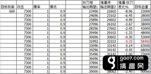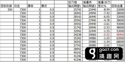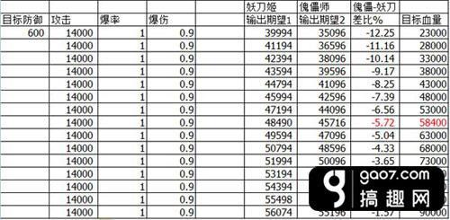 同样带针女的妖刀姬和傀儡师的伤害比较,目标防御减伤公式K=300/(300+防御)