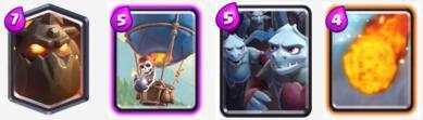 卡组平均耗费4.0,卡组核心是天狗和气球,由于进攻阵容耗费高,前期需要靠采集器攒费,打消耗战。冰法作为防守核心,配合苍蝇海和小骷髅防守能力强。