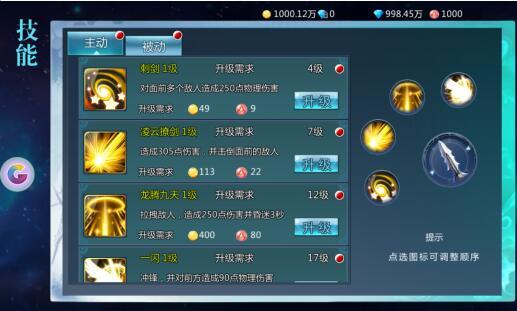 技能分为主动技能和被动技能:主动技能在解锁后会自动放入技能槽,点击右侧技能槽可以进行技能的替换,放入技能槽的技能需要在战斗时点击主界面的对应的技能按钮进行释放,释放后存在一定的冷却时间;被动技能不需要放置到技能槽中即可生效。