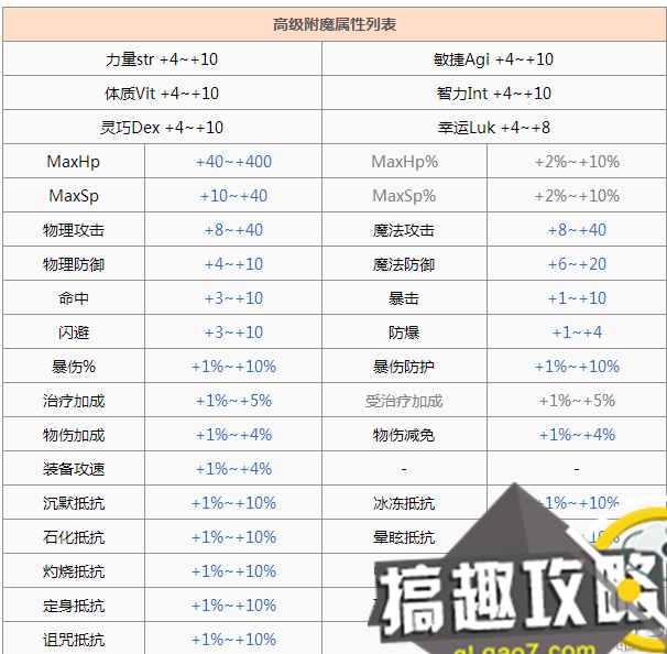每种装备,可附魔的属性也不同,显示灰色的就表示无法附魔到的属性,比如武器无法附魔出衣服才能附魔到的HPSP%,,而衣服无法附魔到武器出的治疗加成。一切等你自己挖掘。