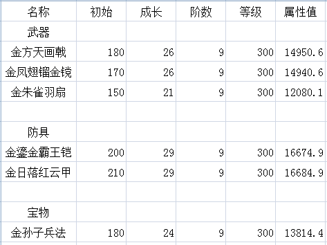 由此表可以很清晰的看出,金色系列,不管是装备,士兵,还是武将,成长值都远远高于其进阶前的水平。金武将配上金装和金兵更是牛逼哄哄,你看,都能达到40000以上的属性,还只是0阶的水平。再看看现在手里的紫将,是不是感觉主属性过1万已经萌萌哒,超2万已经吊炸天了?在金武将面前2万确实掉渣天。