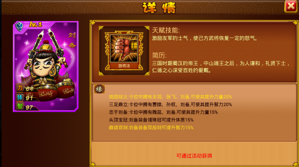 桃园结义:卡位中拥有关羽、张飞、刘备、可使其提升力量20%;
