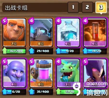 巨人:核心肉卡和消耗卡,巨人有着较高的血量,所以在后期的时候是非常难解的,所以我们在后排搭配一些较强的辅助卡,如女巫/巨石/毒药法术时那么就有非常的保护性,和消耗性,敌方一旦无法抵挡就会崩盘。