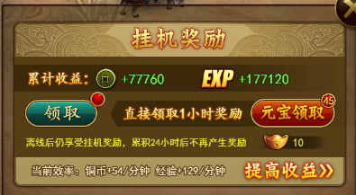 您可以离线挂机或者直接使用元宝领取1小时的挂机奖励,元宝领取的次数会因vip等级而改变。