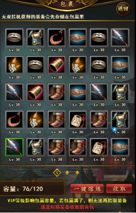 无双任务还有几率获得装备,装备会先存在包裹处,若背包满了则无法再拾取装备了,建议尽快领取哦~vip等级会影响包裹容量。