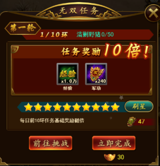 征战任务都刷完了怎么办?如何快速获得经验又不想挂机?那就建议您刷刷我们的无双任务哦,这个是最快捷获取经验的方式。
