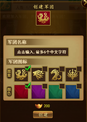 点击创建,输入您的军团名称然后选择您喜欢的军团图标颜色花费200元宝即可创建您的军团。