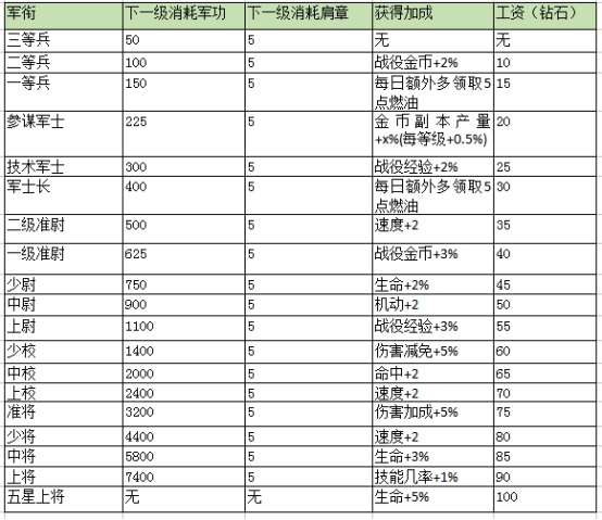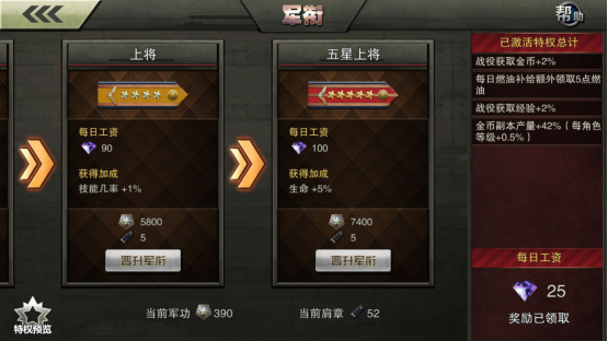 军衔的福利是有目共睹的,最高升到5星上将以后,最高每天可以白领100钻的工资,而且还有超多的属性奖励,例如经验值提升、技能几率提升、生命值提升等等,这都是一次获得终身受益的福利!