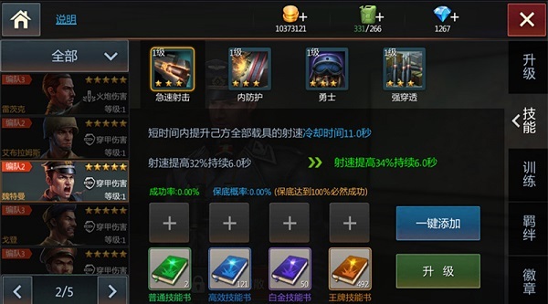 一星/二星车长拥有1个主动技能和1个被动技能,三星/四星车长拥有一个主动技能和2个被动技能,五星车长拥有1个主动技能和三个被动技能。升级车长技能需要消耗技能书,使用的技能书等级越高,技能升级成功率就越高。技能书的获取途径主要是参加战役获得或商城购买。