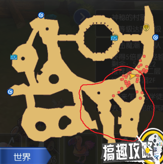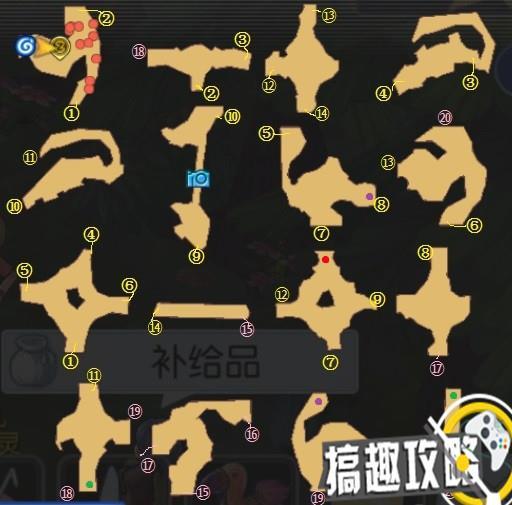 我解释一下,其中huang色的代表会刷mini的比较重要的图,而粉色的就是不那么重要的(16和17可能有误,两个可能是反的,我记不太清楚了毕竟走得太少),然后其中的有几个没标数字的就是北森的单向入口,进去了回不回来的那种。红色指向出口,绿色和紫色如图