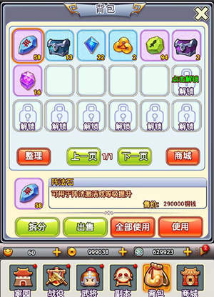 在这里可以看到物料的妙用。阵法石可以激活新的阵法、将魂可以提升武将品质,提品石用以装备提升。