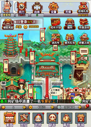 99足金超豪华3D主城诚邀莅临!以下就是游戏的主界面,可以看到这里集合了非常多的玩法,从航海到挖矿到酒馆招募,反正城池的大事小事全部你说了算。游戏不复杂,你也无需具备三国的知识,很快就能上手。小编就简单介绍一二。