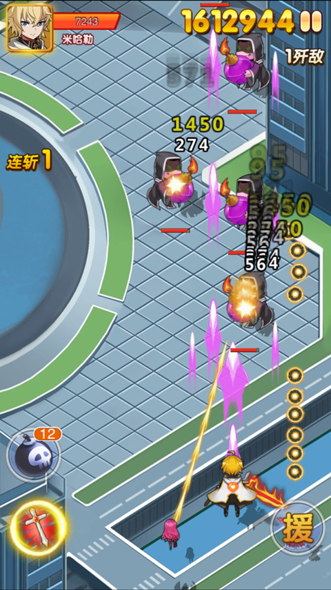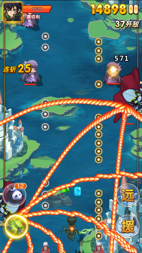 游戏战斗继承了传统飞行射击游戏的操作方式,上手就能玩儿,是我们最重要的设计目标之一。玩家们只需要手指按住屏幕移动就能操控角色移动,而角色的普通攻击为全自动攻击,玩家只需要通过移动找准攻击方向即可快速消灭敌人,非常简单。