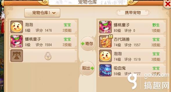 到建邺城找到宠物仙子后,点击宠物仙子,会弹出对话框,点击宠物寄存,既可进去寄存界面。在携带宠物中选择想要寄存的宠物,点击寄存按钮即可存入仓库。相反的,在宠物仓库中选择想要取出的宠物,点击取出按钮即可。