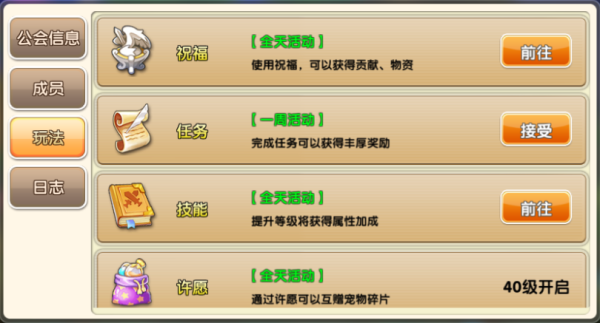 公会界面主要分为四分部:公会信息、成员、玩法、日志。