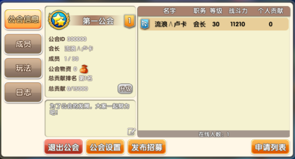 成员:可以查看公会成员的详细信息,如职务、等级、战力、个人贡献、周贡献、在线状态等;