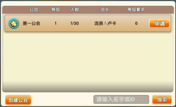 加入现有公会,点击“公会”按钮即可看到当前已创建的公会,当达到入会条件时,即可申请加入公会,等待会长审核同意后,才能正式加入公会。