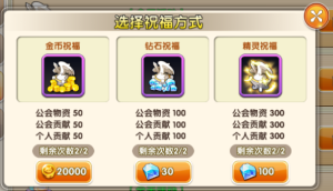 公会祝福可以选择金币和钻石两种方式,捐赠越高,公会贡献越高,获得的贡献可用于公会商店购买道具。