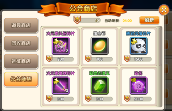 公会商店可以通过花费贡献购买各种装备碎片、武器升阶材料、技能石、宠物碎片、时装等。