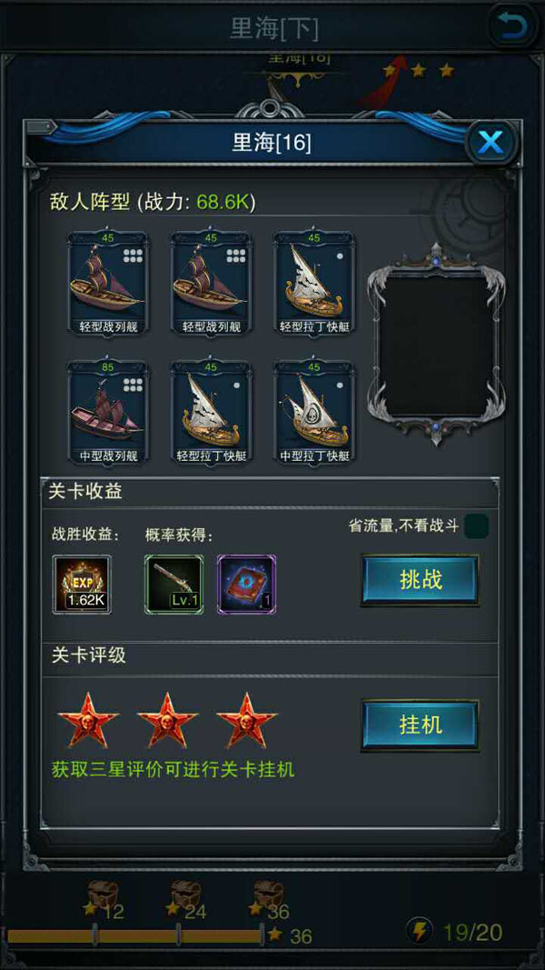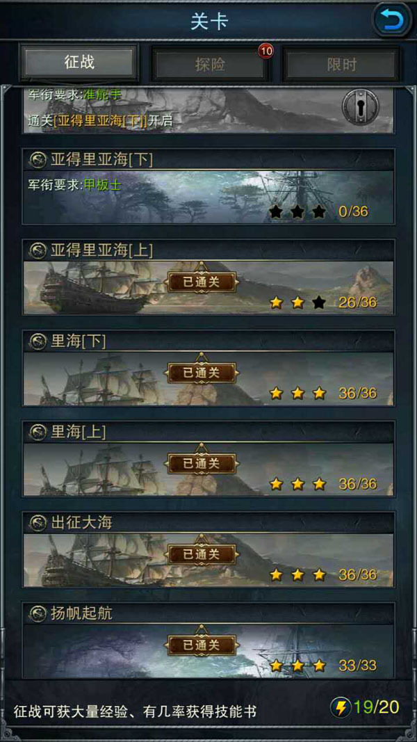 在征战关卡中,玩家需要通关前面一个关卡,才能够解锁下一个关卡,关卡之间的难度逐渐上升,通关关卡获得的经验和掉落的经理也会不断上升。