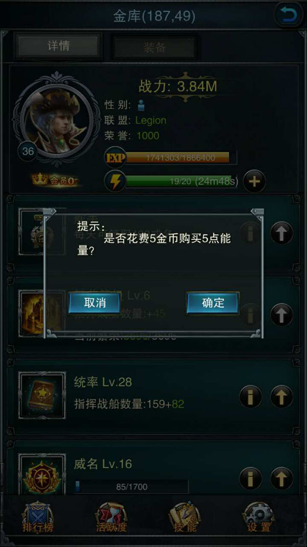但是挑战关卡需要耗费能量,20次的上限,能量耗费后可以自己回复,如果您想加快能量的回复速度,可以在点击角色头像,进入详情界面,在能量条那里使用金币马上获得能量。