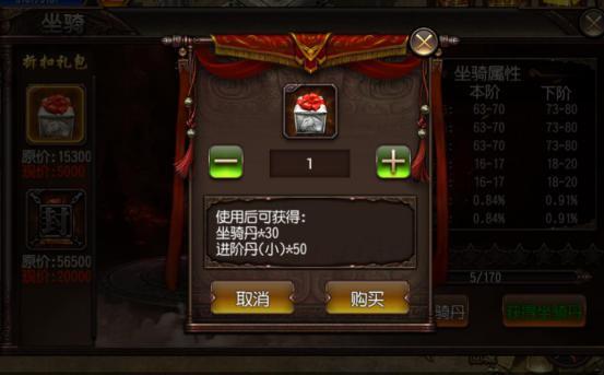 最后一种方法是玩家直接在升级坐骑的页面购买折扣礼包,礼包包括坐骑丹和坐骑进阶丹,购买坐骑礼包是需要用元宝哒~~