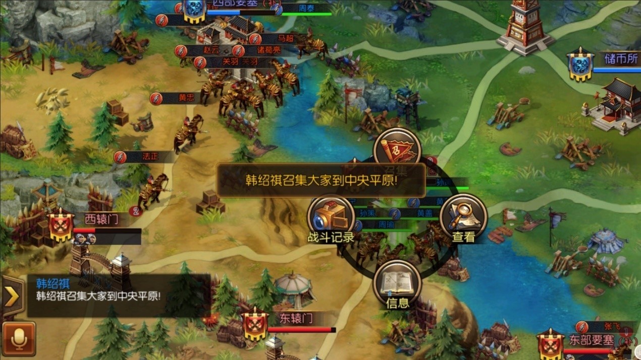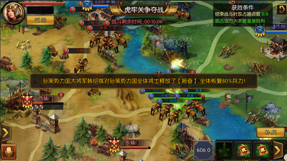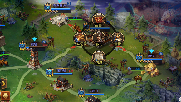 在国战中,大本营和两个要塞都有补兵功能。运粮部队可以从己方粮仓中获取粮食,运送到大本营和要塞中。玩家残血时,前往大本营或要塞,点击补兵按钮即可补血。 中央平原也有回血功能,不过是缓慢回血,当己方占据中央平原时,所有据点中的己方人员都可以享受该效果。另外,中央平原地处要冲,四通八达,可以说是必争之地。 防守方有箭塔,会定期对东西城门、箭塔、守方大本营的敌人进行攻击。攻击将会由上述据点中的所有敌人分摊,人越少伤害越高。所以如果你是进攻方,千万不要单枪匹马去进攻上述据点,否则很可能被箭塔秒杀。 更多据点作用,可以点击据点弹出操作圆盘,然后查看详情。