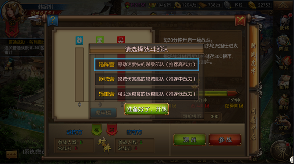 在国战中,每个玩家都可以扮演三种部队: 陷阵营(冲锋部队):移动速度快,攻城伤害低。 器械营(攻城部队):移动速度慢,攻城伤害高。 辎重营(运粮部队):攻城伤害低,运载粮草时移动速度慢。 一场国战中,较为合理的阵容配置,必须在每50人中有3~5名运粮部队,才能保证战斗中获得充足的粮草供应,供己方补充兵力。如果过少,则粮草不济,如果过多,则影响部队战力。运粮部队最好由低战力玩家担任。 冲锋部队以杀伤敌方有生力量为目标,能够较快支援战场,适合战力较高的玩家。一般有10~15名高战力玩家作为冲锋部队即可满足要求。 攻城部队虽移动较慢,但能够较快地攻陷城池,在一些据点的拉锯争夺中有决定作用。攻城部队适合中等战力玩家,必须有一定的自保能力。 战斗中,在保证运粮部队人数的前提下,冲锋部队和攻城部队的人数可根据需要自由调配,但两个兵种的人数差距最好不要过于悬殊。