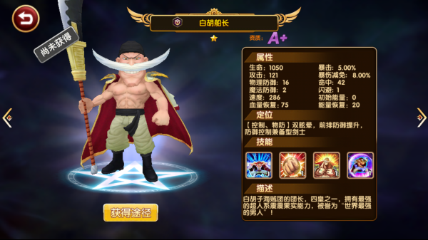 《全明星大乱斗》A+级坦克之白胡船长,白胡子海贼团的团长,四皇之一,拥有最强的超人系震震果实能力,被誉为“世界最强的男人”!