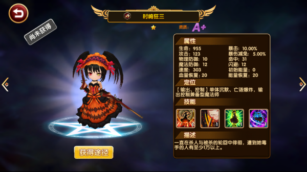 技能1:lv1七之弹(魔法)召唤刻刻帝对敌方后排单体造成六段打击,累积攻击*180%的魔法伤害,附加186点伤害,100%沉默1回合。
