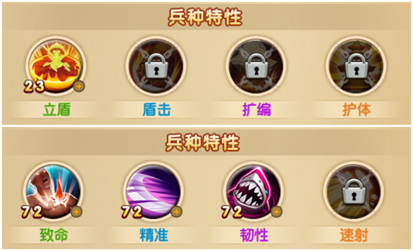 兵种品质每达到一个新的颜色,即可解锁一个兵种特性,最多拥有4个兵种特性。兵种特性的等级可以提升到和英雄等级相同,选择不同的特性偏重,会拥有完全不同的布阵策略。