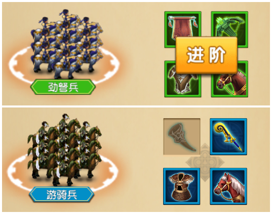 给兵种装备军械,可以提升兵种品质; 兵种品质得到提升的同时,英雄品质也会提升; 品质:白→绿→蓝→紫→橙