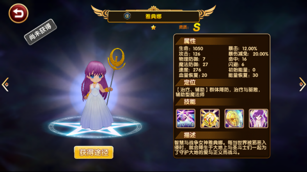 技能1:lv1雅典娜的治愈(魔法)洒遍圣光治愈己方全体血量,治疗量为攻击*130%,附加124点治疗量,同时驱散己方所有负面状态。