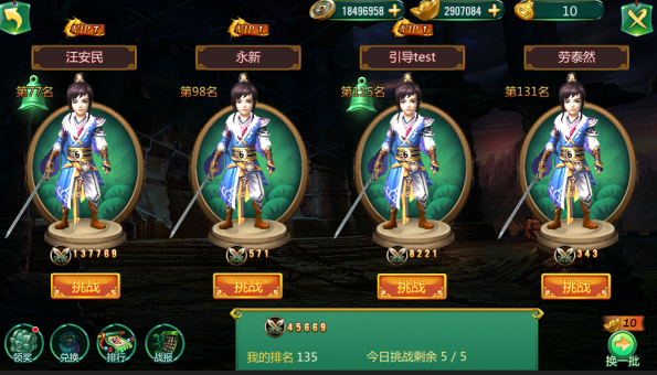 l 花费10元宝可刷新挑战名单;