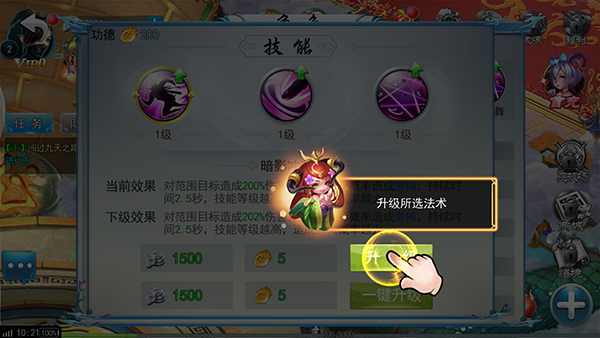 在突破幻境后,我们将来到主城界面,并且有漂亮的仙子教导大家如何升级技能哦!而技能的强度也将决定你的伤害哦!所以可要仔细的学习好咯!