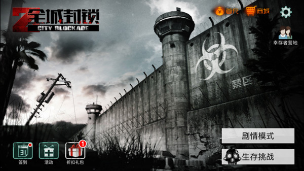 剧情引导结束之后,首先看到的就是游戏的主界面,《全城封锁》的主界面是很简单的,界面左下角是关于活动相关的,包括签到、活动、礼包领取。右下角是关于选择游戏模式的,可以选择剧情模式、生存挑战模式。 ..