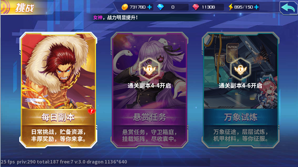 1) 日常副本有三种类型副本,分别为“勇气试炼(经验副本)”、“金币作战(金币副本)”、“正义审判(道具副本,产出相位矩阵)”