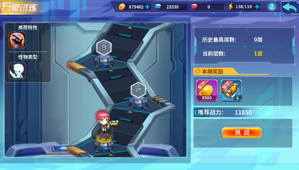 1) 万象试炼类似其他游戏的爬塔功能,通过逐步挑战更高层数的关卡,每层通关后均可获得金币、机甲精华材料,首次通关获得的奖励会更多