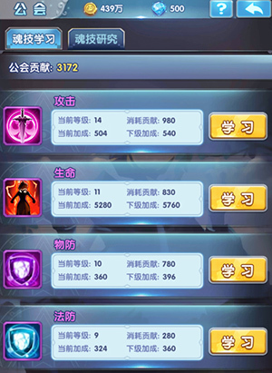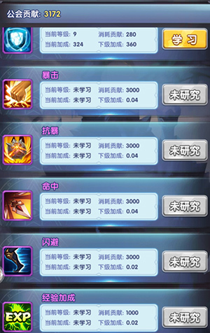 所有的研究都需要花费公会贡献点,而攻击到法防等4大基础属性的研究花费都是相对的少的,此外的属性花费都高的吓人!即便是初级的暴击,研究一次都需要3000贡献点。