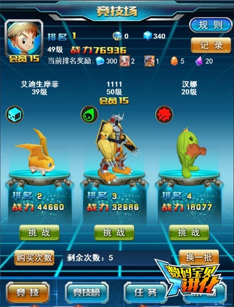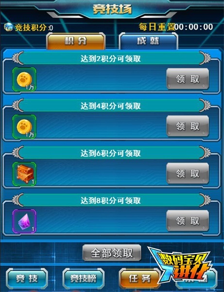 竞技场是各位数码宝贝冒险者可以相互竞技并且展现自身实力的地方,获得的排名越高,奖励就会越丰厚哟! 每挑战一次均可获得积分与水晶碎片,失败也会有哦~达到一定的积分就可以在任务栏领取对应奖励。 ..
