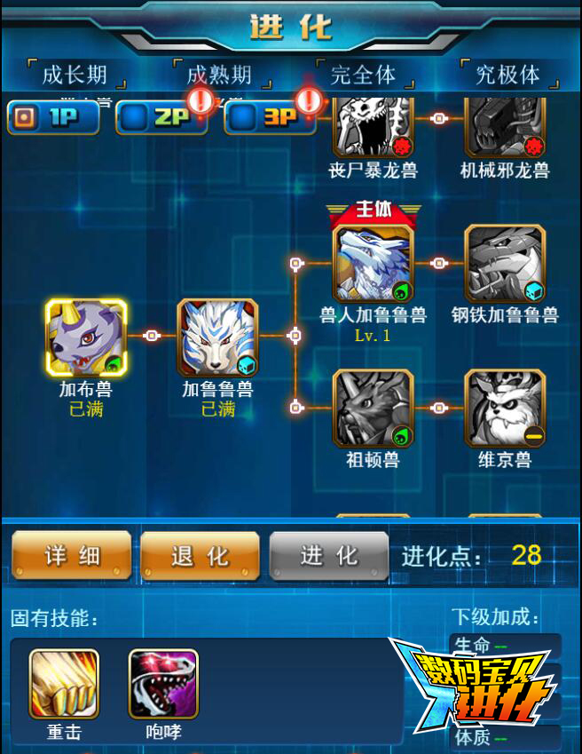 进化分为4阶段,分别为:成长期、成熟期、完全体、究级体