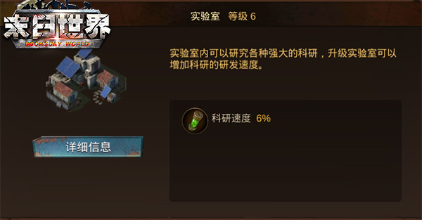 《末日世界》的实验室专注科技研发,能够提升基地里的建筑、指挥官、兵种等等的属性,有利于一切基地内的各种升级!里面的各类研究需要分先后手,先研究自己急需的,再选择其它的。