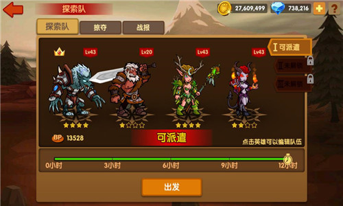玩家可以派出自己的一队英雄去探索关卡,玩家可以设置探索时间,时间到了即可收获探索奖励。