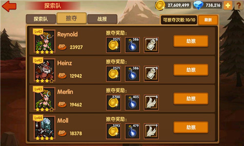 除了探索队外还可以对其他玩家进行掠夺,劫掠次数上限为10次,如果次数不满则每隔一段时间就会回复。如果劫掠成功就会获得英雄升品材料,金币,经验瓶