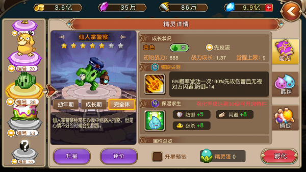 帝王蝾螈先攻伤害高达195%还附带先攻加成12的BUFF,仙人掌警察完全体先攻伤害也有190%并且附带14的防御BUFF加成。都算是非常高的斩杀伤害,然而在开不到高伤害的精灵时,第二考虑的因素就是BUFF,精灵与魔法中造成减益效果的DEBUFF非常多,但是适合流派的DEBUFF就比较少了,我觉得最优质的减益效果是混乱、冰冻和敌方下回合伤害降为1。