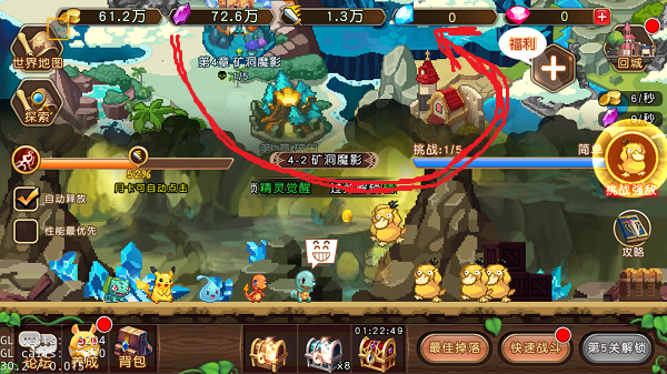 除此之外还有快速获取福利的按钮---快速战斗和宝箱,是不是美滋滋,总之游戏这一版玩儿下来呢,夏天的个人体验就是虽然是像素游戏,美术和策划爸爸更加用心了,相比于之前模糊的形象,这一版的精灵更具特色,各类按钮也更加简洁实用。希望我在这里吹完之后,爸爸们可以给我发一个变色杯,嘿嘿。
