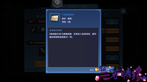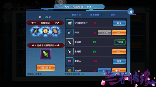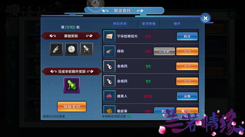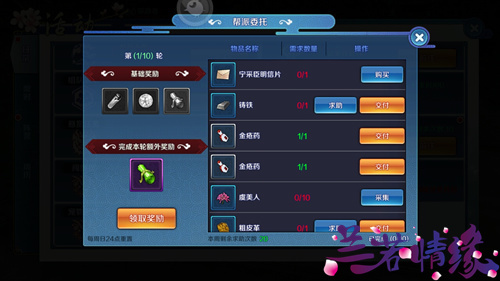 帮派委托的物品都会标明出处,可如果实在无处可寻,也可以点击求助帮派成员。有些特殊物品如“宁采臣的明信片”,可以花费少量代币在商店中购买。还有一部分采集任务,点击后会自动前往采集。